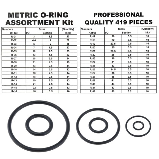 Zestaw zawiera 32 popularne rozmiary [rozmiary (średnica wewnętrzna x grubość przekroju)]: