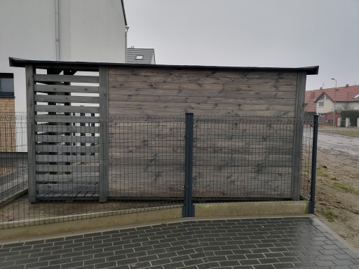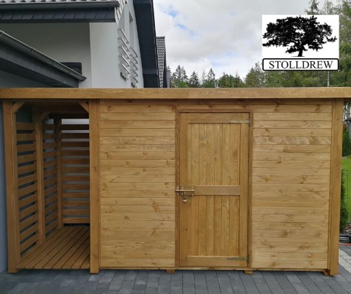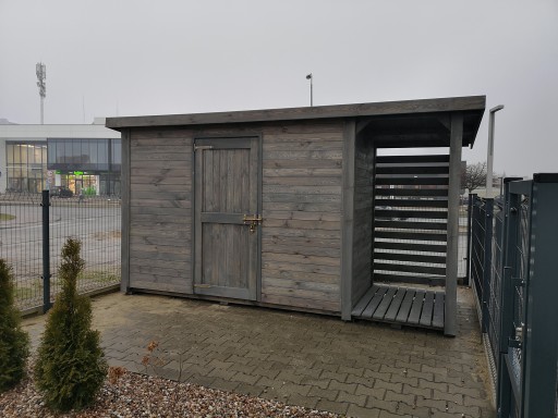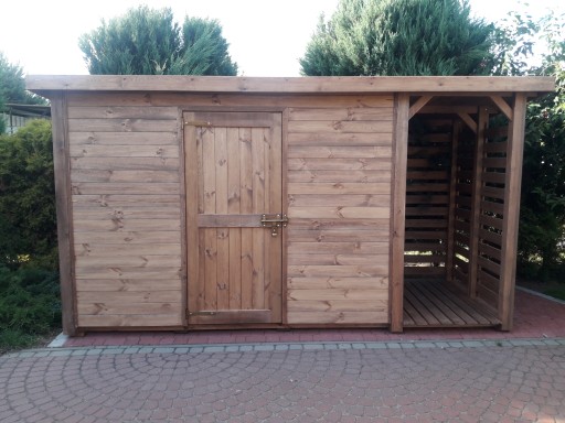 Domek narzędziowy 3 x 1,5m (po prawej lub lewej stronie) + drewutnia 1 x 1,5m w konstrukcji słupowej z dachem prostym jednospadowym (do tyłu)