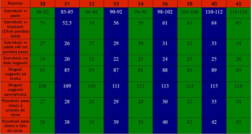 - W celu doboru odpowiedniego rozmiaru proszę zapoznać się szczegółowo z tabelą rozmiarów, i porównać ze swoimi spodniami, które są dobre. Proszę nie sugerować się rozmiarem z metki, różni producenci stosują różne rozmiarówki. Wszystkie pomiary i zdjęcia są mojego autorstwa i przedstawiają realny produkt, aktualizowane dla każdej nowej partii towaru.