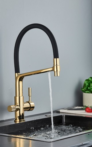 BATERIA KUCHENNA TRÓJDROŻNA Z WYCIĄGANĄ WYLEWKĄ KRAN KUCHNIA ZŁOTA FILTR
