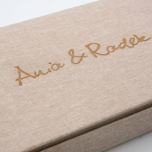 Pudełko na zdjęcia zrobione jest z grubej i sztywnej tektury pokrytej grubym materiałem.