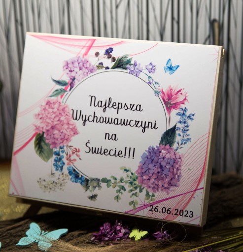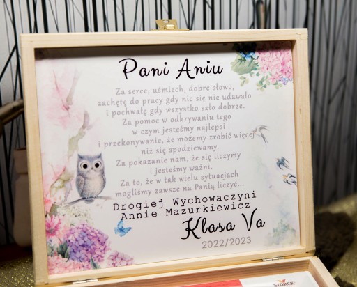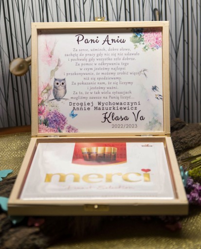 Podziękowanie w formie drewnianego pudełka/skrzyneczki na zakończenie roku szkolnego dla kadry nauczycielskiej z grafiką pasującą do uroczystości oraz z personalizacją. Jest to bardzo elegancki pomysł na podziękowanie za cały rok nauczania, współpracy i wsparcia. Świetny pomysł również jako prezent na Dzień Nauczyciela.