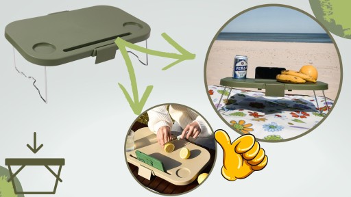 - ✅ Pokrywa po zdjęciu może słuzyć zarówno jako stolik (składane metalowe nóżki) jak i deska do krojenia, co jest niezmiernie przydatne podczas pikniku