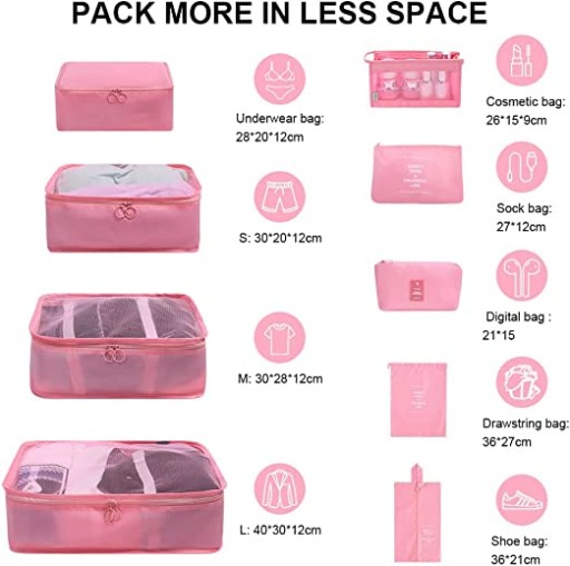 1 x duża torba siatkowa, 1 x średnia torba siatkowa, 1 x mała torba siatkowa, 1 x kieszeń ze sznurkiem, 1 x torba na bieliznę, 1 x płaska kieszeń, 1 x torba na buty, 1 x torba na pranie, 1 x torba cyfrowa; pozwala na łatwe uporządkowanie przedmiotów. Pozwalają łatwo uporządkować rzeczy, zaspokajając wszystkie Twoje potrzeby podczas podróży.