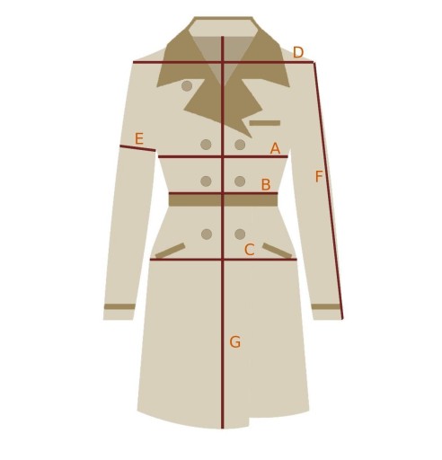 Podane wymiary w tabeli dotyczą zapiętego płaszcza mierzonego na płasko (różnica może wynosić +/- 2 cm). To umożliwia porównanie wymiarów z już posiadanym płaszczem. Modelka ma 175 cm wzrostu i prezentuje rozmiar 38.