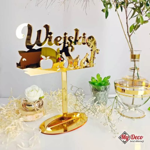 "Napis na Wiejski Stół" wykonany jest z lustrzanej pleksi w złotym kolorze, nadającej mu wyrafinowany, a jednocześnie ciepły wygląd.