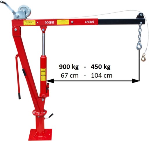 - Długość wysięgnika mierzona od siłownika do haka: 67 - 104 cm (zabezpieczany w 2 długościach)