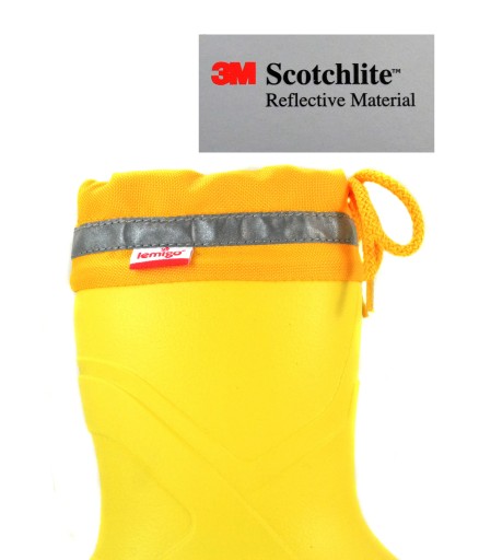 Specjalnie w trosce o bezpieczeństwo Państwa pociech kalosz został wykończony poliestrowym kołnierzem z taśmą odblaskową z firmy 3M, dzięki czemu nawet przy mglistej pogodzie, czy słabej widoczności Państwa Dzieci będą widoczne ze znacznie większej odległości.