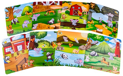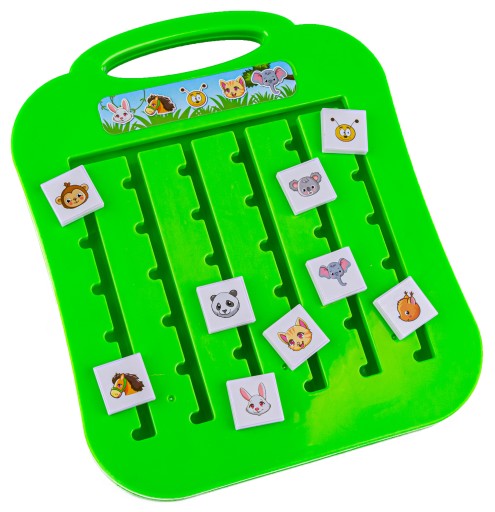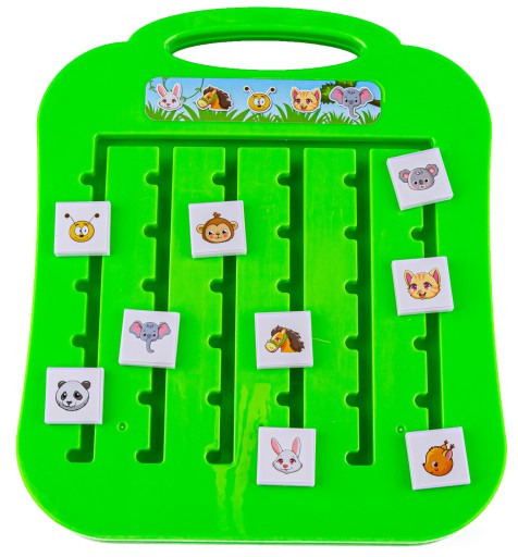 Zadaniem dziecka jest takie ułożenie zwierzątek na planszy jak w wylosowanej karcie. To wcale nie takie proste - zwierzątka mogą się wzajemnie blokować. Aby podnieść poziom trudności można ustalić rozwiązanie zadania w czasie.