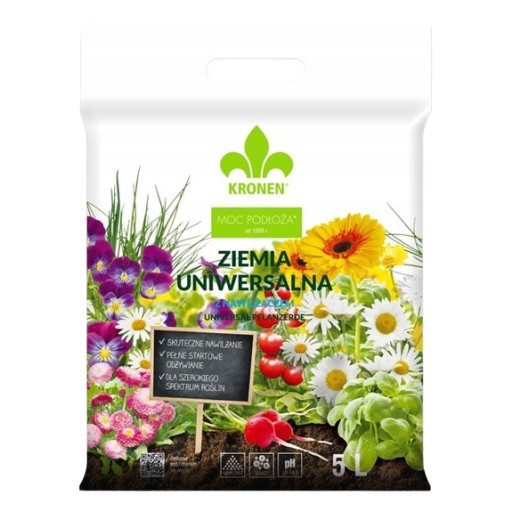 KRONEN® Ziemia uniwersalna z nawilżaczem jest przeznaczona do sadzenia i przesadzania wielu gatunków roślin zielonych i kwitnących, warzyw, ziół, bylin, iglaków w domach na balkonach, tarasach i w ogrodach, z wyjątkiem roślin kwaśnolubnych.