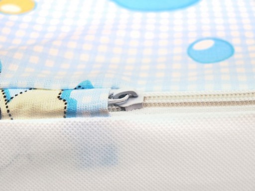 Aby dziecko nie miało dostępu do gąbki, po zamknięciu pokrowca, główka zamka każdorazowo chowana jest całkowicie w specjalnie naszyty - odpowiedniej wielkości „tunel” z tkaniny, który uniemożliwia odsunięcie zamka i dotarcie do gąbki.