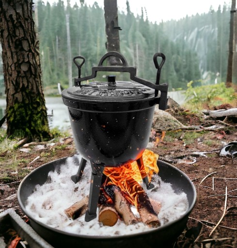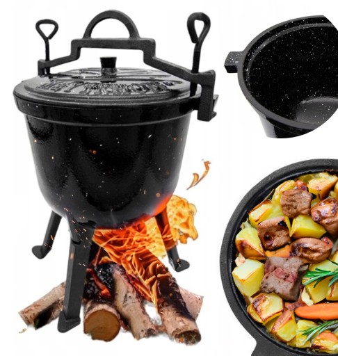 Oryginalny kociołek Meyerhoff wykonany z najwyższej jakości stopu żeliwa odpornego na najwyższe temperatury. Specjalny odpowietrznik w pokrywie, który reguluje ciśnienie wewnątrz kociołka, przez co jest on w 100% bezpieczny. W środku pokryty żaroodporną emalią, która chroni i zabezpiecza wnętrze kociołka, dodatkowo ułatwiając jego mycie i konserwacje (nie ma potrzeby impregnowania po każdym użyciu). Kociołek dzięki poręcznemu uchwytowi może być zawieszony również nad ogniskiem. Produkt posiada odkręcane nóżki, przez co kociołek można umieścić w kominku lub bezpośrednio w palenisku. Dzięki wytłoczeniu na pokrywie masz pewność, że kupujesz oryginalny i bezpieczny produkt.