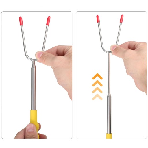 Teleskopowy kijek do opiekania z dwoma końcówkami do obracania składników na grillu, pieczenia kiełbasek oraz innych plenerowych czynności. Dzięki teleskopowej rękojeści można regulować jego długość od 30 do 114 cm.
