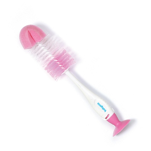 Szczotka z przyssawką „SAMOSTOJĄCA” pomaga w dokładnym czyszczeniu zarówno butelki, jak i smoczka. Szczotka posiada przyssawkę, która umożliwia przyczepienie jej do płaskich powierzchni, dla ułatwienia osychania. Szczotka do butelki jest zakończona miękką gąbką, która dostosowuje się do kształtu butelki. W uchwycie rączki jest schowana mała szczotka do czyszczenia smoczka. Miękkie włosie szczotek i gąbka docierają do trudno dostępnych miejsc. Szczotki wykonane są z trwałych i bezpiecznych materiałów, nie zawierających Bisfenolu A.