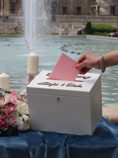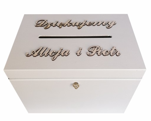 Na górnym wieczku znajduję się napis „ Dziękujemy” oraz imiona nowożeńców. Kartki, koperty wrzuca się od góry poprzez wycięty w skrzyneczce otwór.