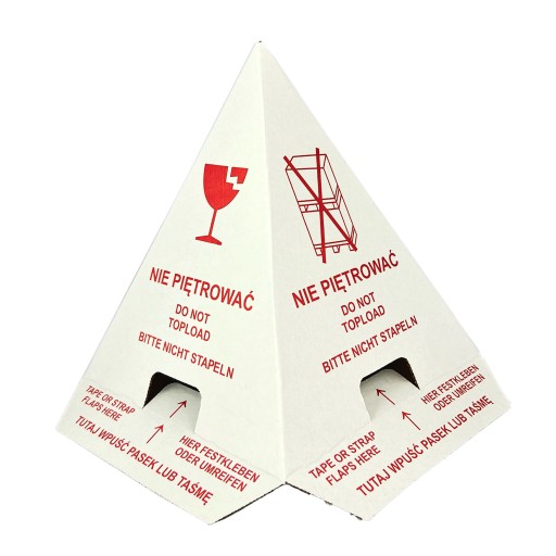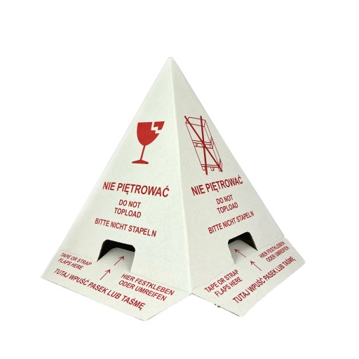 Stożki (kartonowe nakładki) ostrzegające przed piętrowaniem pojedyńczo pozostawionej palety. Doskonale widoczne na zapisie kamer monitoringu. Umieszczone na chronionej palecie w widoczny sposób informuje o zakazie piętrowania.