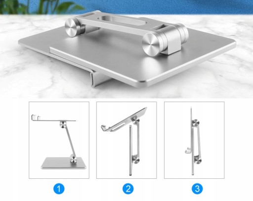 Produkt posiada lekką, ale stabilną aluminiową konstrukcję z możliwością regulacji oraz złożenia. Pozwala na ułożenie urządzenia pod odpowiednim kątem, co skutkuje lepszą ergonomią pracy oraz utrzymaniem zdrowej pozycji podczas pracy.