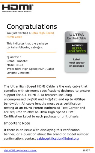 ✅ Kupując u nas, masz gwarancję, że otrzymasz certyfikowany kabel HDMI 2.1 wydany przez organizację HDMI.org