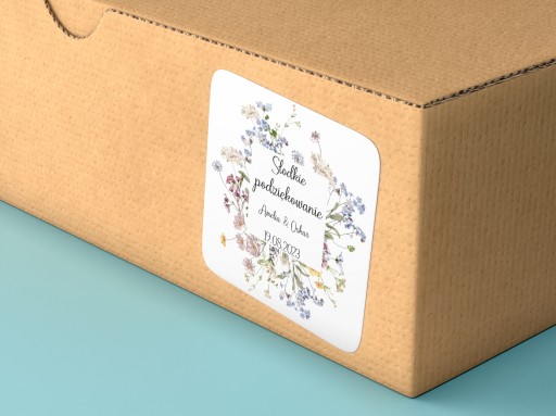 Przedmiotem oferty są personalizowane kwadratowe samoprzylepne naklejki ze słodkim podziękowaniem, przyozdobione kwiatami.