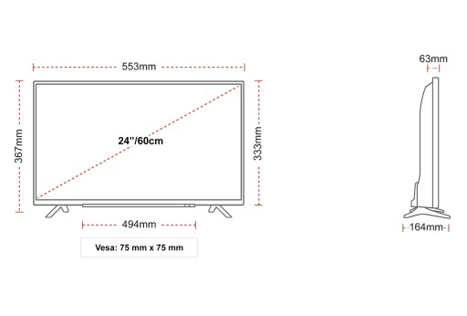 - Wymiary: z podstawą: 553 x 164 x 367 mm, bez podstawy: 553 x 63 x 333 mm