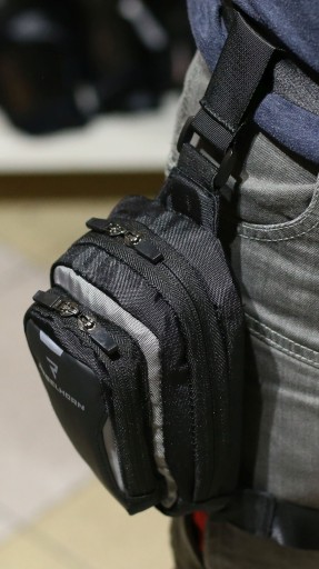 - Silikonowy element na torbie umożliwia utrzymanie torby w stałej pozycji na nodze