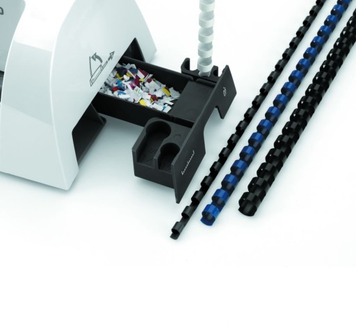 - Ergonomiczna. Specjalna szuflada na ścinki z opatentowanym systemem mierzenia grubości dokumentów i doboru odpowiedniego grzbietu