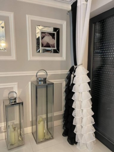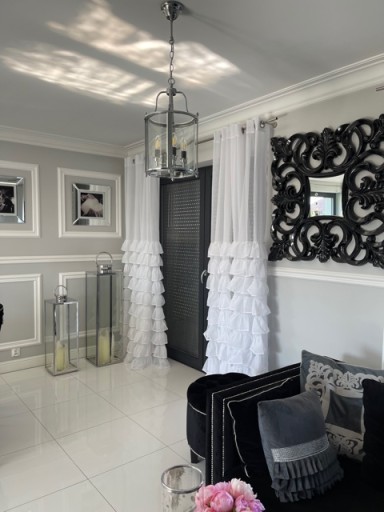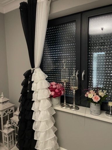 Piękne zasłony zdobione falbankami od dołu. Zasłony mają 10 falban.