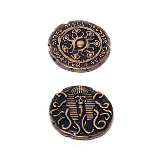 Wykonana ze stopów cynku precyzyjnie zdobiona moneta, która została ozdobiona symbolami kultystów. Na przestrzeni wieków różne podania historyczne zawarły w sobie opis organizacji, które wykazywały niepokojące podobieństwa. Niektórzy badacze wyciągali śmiałe wnioski, jakoby wszystkie teksty prawiły o jednym stowarzyszeniu, o kulcie, który do dziś czai się w cieniu. Wielu szanowanych profesorów wybuchało śmiechem na wzmiankę o tej teorii, bo obejmowała ona czasy Egipcjan, Azteków i Celtów. „Skąd niby stowarzyszenie wzięłoby portale i zaawansowaną technologię? Bo niby jak mieliby pojawiać się w wielu miejscach i okresach historycznych jednocześnie? Te kultury nigdy się nie spotkały. To absurd” denerwowali się. A jednak wnikliwi obserwatorzy dostrzegali podobieństwa symboli we wzorach różnych kultur i stylów. Oczy osadzane na czułkach i wijące się jak żyły w ciele chude macki. Czciciele obcej cywilizacji. Obserwatorzy. Tak ich nazywano. Ostatnio pojawiły się zarzuty do uczonych, że również do nich należą, bo kult ma wszystkie wpływowe osoby w garści. Głosy, które je głosiły, przepadały powoli w niepamięć. Zapadali na choroby, padali ofiarą wypadków, zaginięć i przedziwnych zmian osobowości.