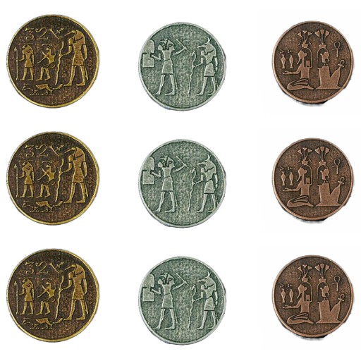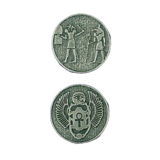 Wykonany ze stopów cynku zestaw 9 cudownych, ciężkich monet które odkopaliśmy wraz ze skrzynią pełną skarabeuszy. Ktoś chce jednego? Amon Ra spojrzał na swój udręczony lud i zesłał im plagę urodzaju. Odtąd wody wylewały na wiosnę i rosiły pola, które latem dawały plon obfity. Set, widząc, co jego brat uczynił, przebrał się za śmiertelnika i wkradł na dwór faraona. Wtedy rzekł mu „Władco, proponuję szybszy sposób wymiany dóbr, niż gliniane tabliczki ryte przez twych skrybów. To nie ma tak, że jest to dobre czy niedobre, ale jeśli zapytasz mnie, co cenię w życiu najbardziej, odpowiem, że pieniążki. Twoi poddani będą czcić cię za to. Wybij monety ze swoimi podobiznami”. Faraon tak uczynił i przyozdobił pieniądz swym profilem, zawarł również na nich portrety bogów. Ra spojrzał po wielu dniach drzemki na swój lud i ze zgrozą odkrył przebiegły plan Seta. Odtąd Egipcjanie tworzyli chciwie majątek na fałszywych obietnicach narodowej waluty, uciskali chłopów i wprowadzili niewolnictwo, by gromadzić stosy monet w swoich skarbcach. Poważany nie był wytwórca, ale zdolny pośrednik, cwaniaczek bez skrupułów i moralności, pijawka społeczna na zdrowej tkance Egiptu. Amon Ra zezłościł się mocno na swój lud i zesłał im największą plagę znaną tamtemu światu – Izraelitów z magicznymi zdolnościami rozstąpienia Morza Czerwonego.
