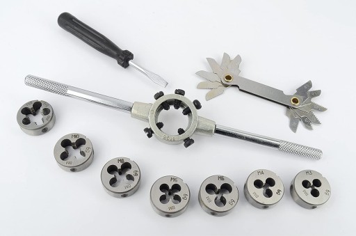 - Dołączone komponenty: 21 gwintowników w rozmiarach M3 do M12, 7, gwintowniki w rozmiarach M3 do M12, łącznie z gwintownikiem i uchwytem narzynki, śrubokrętem, miarką do gwintów w metalowej kasecie