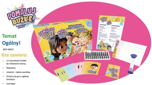 W zestawie jest 12 naturalnych kredek do malowania twarzy, klepsydra, notatnik - tabela wyników, 24 karty do gry o tematyce ogólnej.