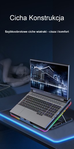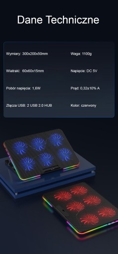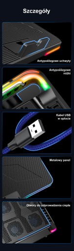Podstawka pod laptopa to przede wszystkim nowoczesny wygląd, stabilna konstrukcja oraz wydajny system wentylatorów z możliwością regulacji obrotów. Rozmieszczenie wentylatorów zapewnia doskonałe i efektywne chłodzenie laptopa bez względu na umiejscowienie nagrzewających się podzespołów notebooka (procesor, karta graficzna, układy zasilania, dyski twarde). Szeroka kompatybilność z laptopami i notebook'ami o różnych wielkościach matryc 10,12,13,14,15.6, 16''. Konstrukcja umożliwia korzystanie z podstawki na kolanach. Hydrauliczne łożyska pracują bardzo cicho. Przy ustawieniu najniższych obrotów wentylatorów hałas jest praktycznie niesłyszalny. Dolna część podstawy posiada dodatkowe nóżki zwiększające kąta nachylenia, tak aby zapewnić jak największą ergonomię pracy.
