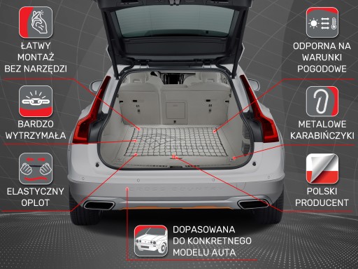 - Siatka sprzedawana jest wraz z czterema haczykami montowanymi do fabrycznych zaczepów w aucie.