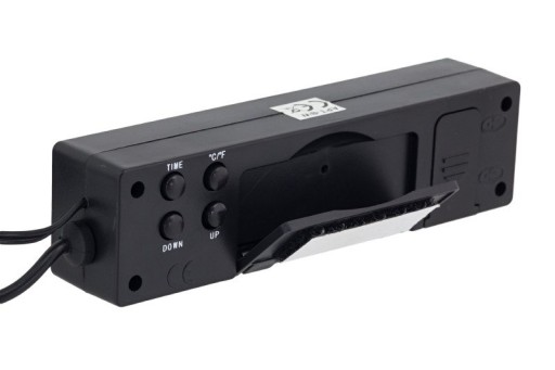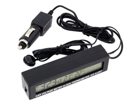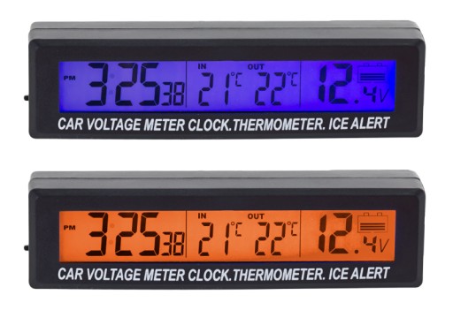 - Termometr posiada duży, czytelny wyświetlacz LCD z niebieskim podświetleniem(zasilanie z gniazda zapalniczki samochodowej) wyświetlającym jednocześnie temperaturę z dwóch czujników, godzinę oraz napięcie akumulatora.