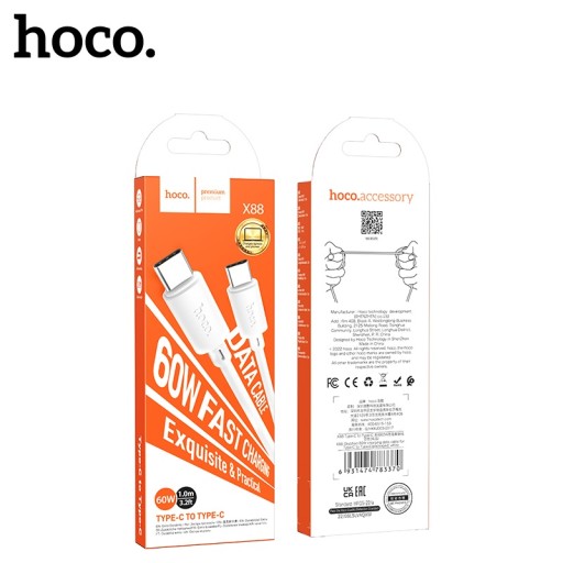 hoco. X88 Gratified to szybki kabel USB PD / Power Delivery z dwoma złączami USB Type-C / Typ C / Typu C i maksymalnej mocy przesyłowej 60W. Kabel obsługuje szybkie ładowanie w standardzie Quick Charge 3.0 / 4.0 / QC3.0 / QC4.0 jak również posiada kompatybilność wsteczną do standardów QC2.0 oraz QC1.0. Kabel jest wykonany z materiału typu PVC i ma długość całkowitą 1M / 100 cm. Kabel jest kompatybilny ze smartfonami, telefonami, laptopami czy notebook'ami oraz innymi urządzeniami ze złączem USB Type-C.