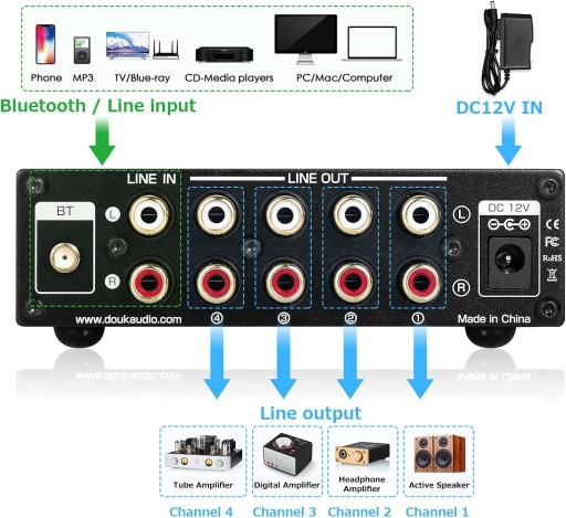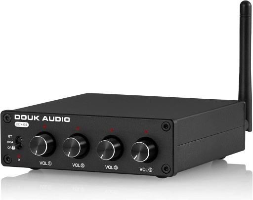 Douk Audio Mini Bluetooth 5.0 Stereo przedwzmacniacz 4-kierunkowy rozdzielacz audio RCA przełącznik wyboru skrzynki.