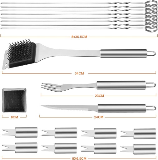 W zestawie: 1x szczypce, 1x łopatka, 2x pojemnik na pieprz/sól/przyprawy, 1x skrobak do rusztu, 1x zapasowa druciana szczotka do skrobaka, 1x duży nóż, 1x silikonowy pędzelek, 1x widelec do mięsa, 4x widelec, 4x nóż, 8x szpikulec do szaszłyków, 8x uchwyt do kukurydzy/warzyw