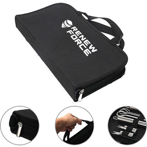 Aż 33 przybory do grillowania zamknięte w praktycznym etui posiadających zamek błyskawiczny oraz uchwyt do transportu.