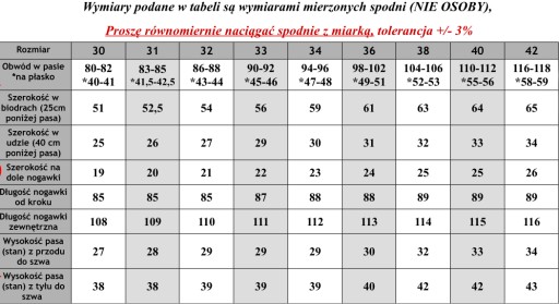 - Spodnie po przymierzeniu powinny być raczej "na ciasno" gdyż nowe spodnie mają tendencję do rozbijania (rozciągania) się po chwili używania o pół nawet do jednego rozmiaru.