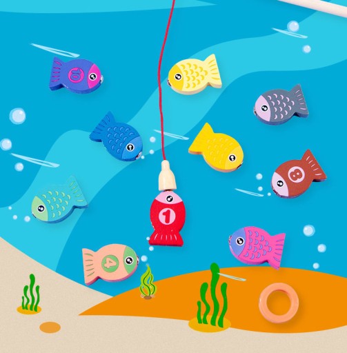 - Rybki: Dopasujcie rybki kolorami do ich wyznaczonych w planszy miejsc. Rybki można wkładać i wyjmować z pomocą dołączonej wędki, to świetna i zajmująca zabawa.