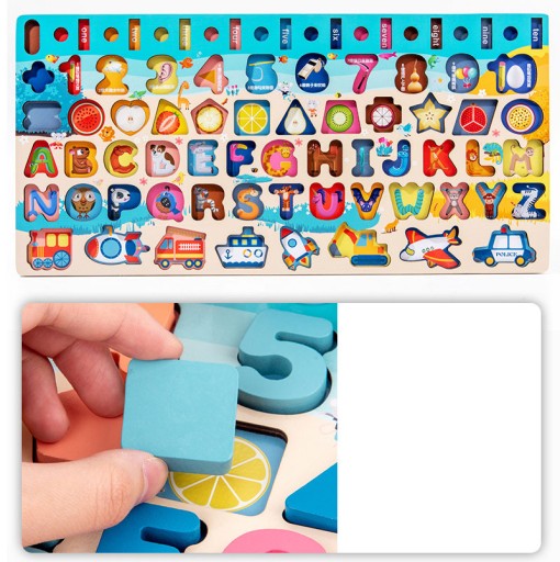 - Literki, kształty, rysunki pojazdów: Dopasuj kolorystycznie oraz kształtem klocki do luk na planszy. Literki pomogą także w nauce czytania czy ich rozpoznawaniu przez dziecko.
