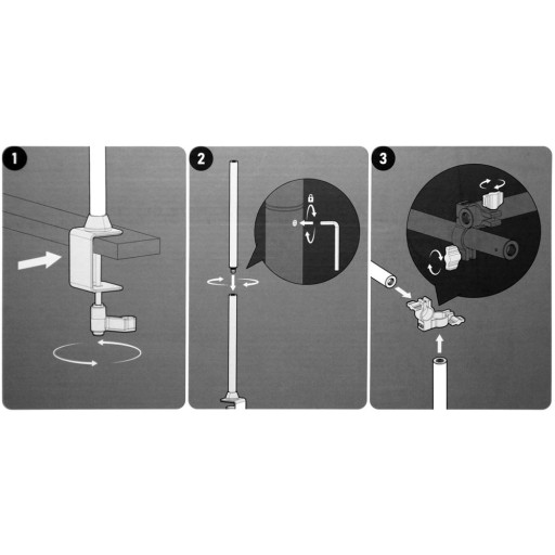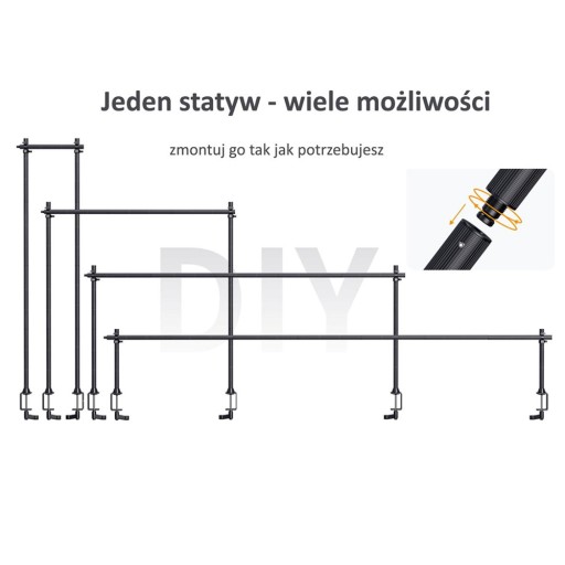 Każdy segment montażowy jest zakończony grubym gwintem. Możliwość swobodnego łączenia elementów pozwala nam skonfigurować statyw idealnie dopasowany do naszych potrzeb bądź biurka, przy którym pracujemy. Podpory i segmenty dodatkowe mają długość 40 cm. Zaciski do blatu to solidne, metalowe imadła o maksymalnym rozstawie szczęk wynoszącym aż 9 cm. Łączenie poszczególnych elementów pozwoli nam stworzyć zestaw o parametrach: