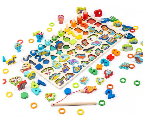 ➡️Figury: Plansze posiadają luki o różnych kształtach do których dopasowane są drewniane klocki. Dziecko musi odnaleźć pasującą figurę i ułożyć ją tak aby bez problemów wpasowała się w lukę. Każda luka posiada w środku małą ilustrację, możesz zachęcić dziecko do rozpoznawania jaki obrazek tam widzi. Dopasuj rysunek z figurki do tego w planszy. W zestawie znajdują się figury zwierzątek, dinozaurów, pojazdów a także kolorowe kształty geometryczne.