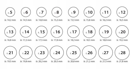 Wartość, którą wskaże Ci suwmiarka w milimetrach, należy przełożyć na faktyczny rozmiar pierścionka podany w tabeli poniżej.