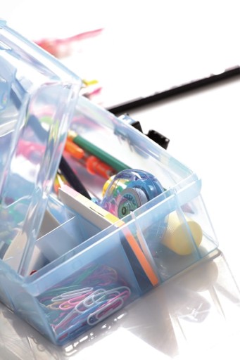 - Przezroczysta obudowa umożliwia zajrzenie do wnętrza organizera bez otwierania pokrywy.