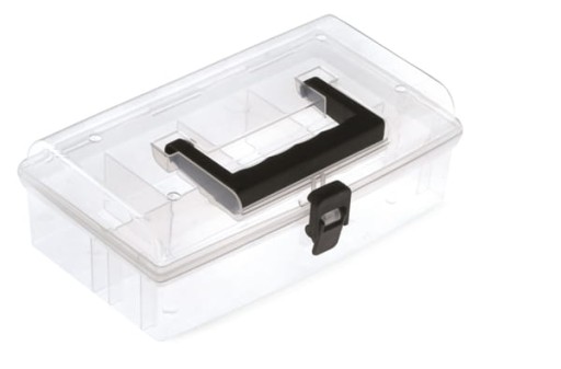 - Przezroczyste pudełko narzędziowe z zamknięciem i uchwytem, wykonane z tworzywa sztucznego.