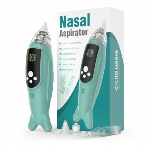 LifeBasis Higieniczny elektryczny aspirator do nosa to 5 mocy ssania, 3 rodzaje końcówek odpowiednie dla dzieci od noworodka do kilku lat oraz 3 rodzaje regulowanej muzyki dla lepszego komfortu dziecka.