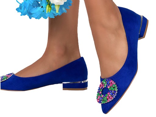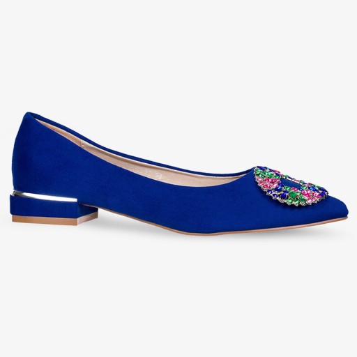 - modne chabrowe baleriny damskie z efektowną ozdobą