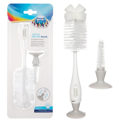 Praktyczna szczotka ułatwia mycie butelek i smoczków. Większa szczotka posiada gąbkę, która pozwala na wygodne mycie dna butelek. Mniejsza, ukryta w końcówce z przyssawką, nadaje się do czyszczenia smoczka z resztek mleka lub kaszki. Szczotka posiada specjalną przyssawkę, która umożliwia stabilne ustawienie szczotki na gładkim podłożu.