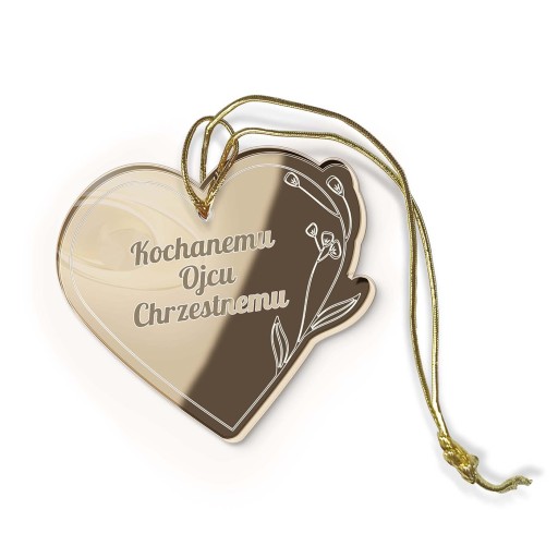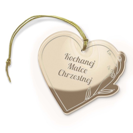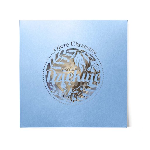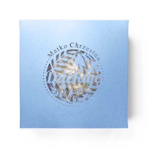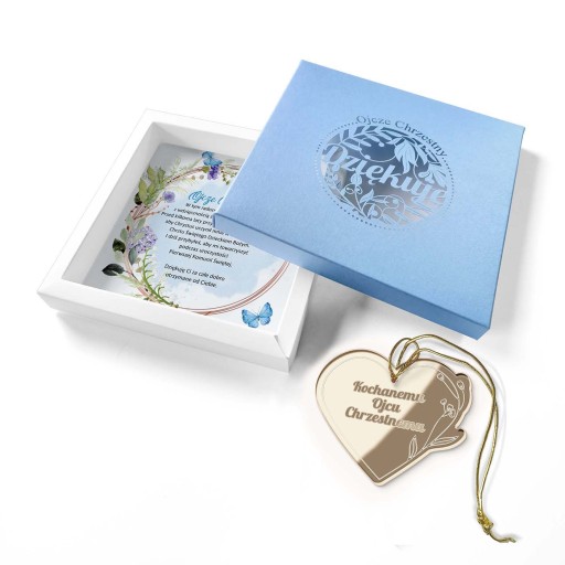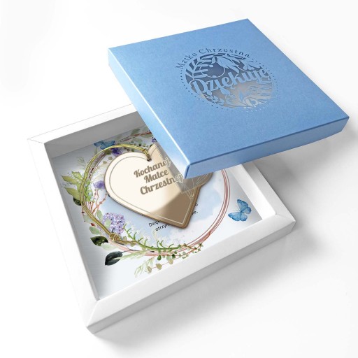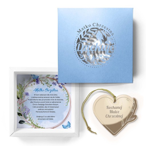 Komplet zawiera dwa podziękowania w ozdobnych pudełkach, jedno dla Chrzestnej, a drugie dla Chrzestnego. Złote serca będą stanowić niezapomnianą i trwałą pamiątkę tego wspaniałego dnia. Serca wykonane z lustrzanego tworzywa zapakowane w piękne ozdobne pudełka wykonane z wysokiej jakości ozdobnego niebieskiego papieru. Wieczko ozdobione precyzyjnym cięciem laserowym. Wewnątrz wydrukowane podziękowanie dla Chrzestnej i Chrzestnego ozdobione kwiatowym motywem.
